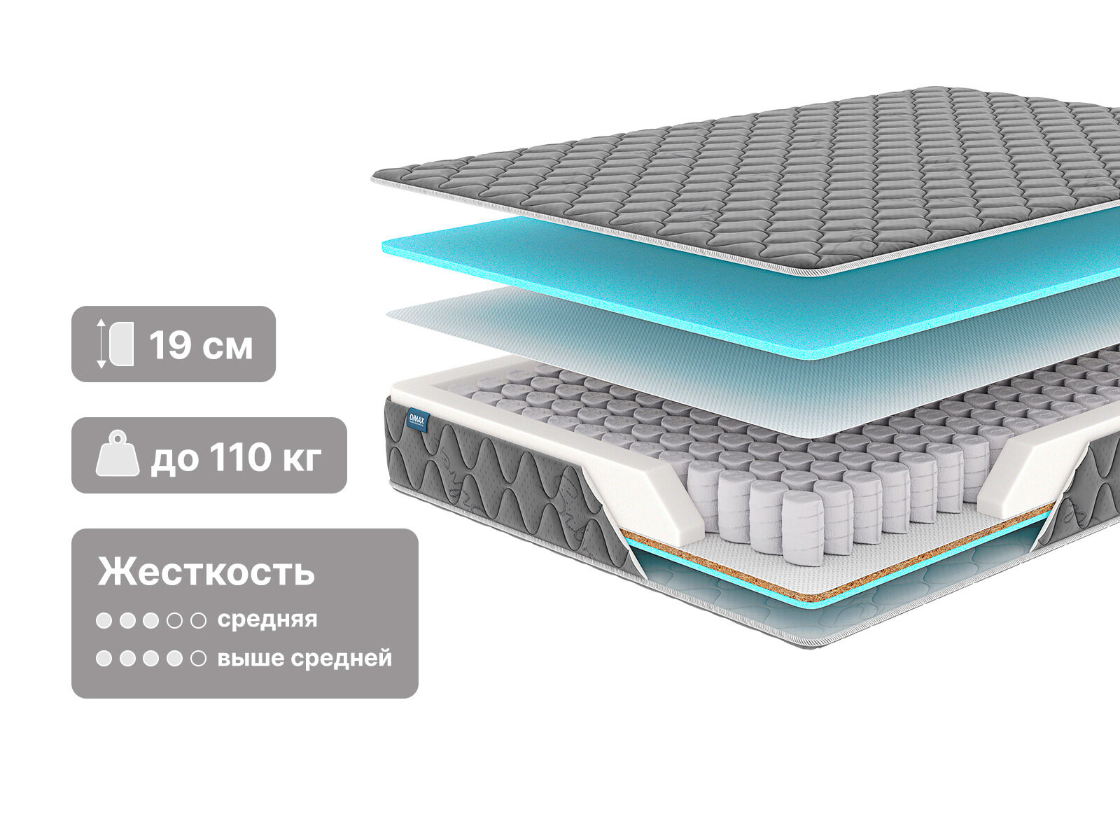 Натуральный кокосовый слой делает матрас жёстче и помогает удерживать спину в правильном положении. Кокос усиливает ортопедические качества модели.