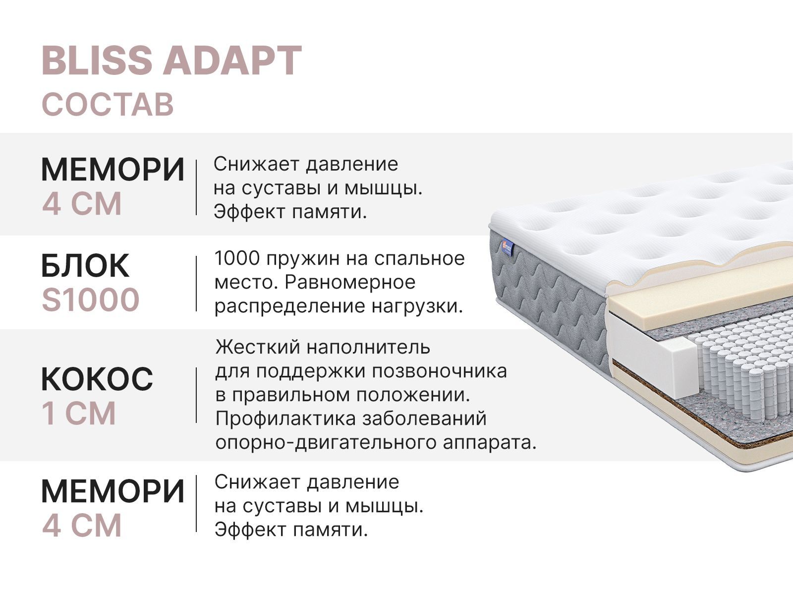 Димакс Bliss Adapt — уникальный по комфорту матрас, который подарит вам самый уютный сон, как в отеле. Сочетание пены с эффектом памяти Мемори, натуральной кокосовой койры и независимых пружин «Мультипакет» создаёт идеальный баланс между мягкостью, поддержкой и ортопедическим эффектом.