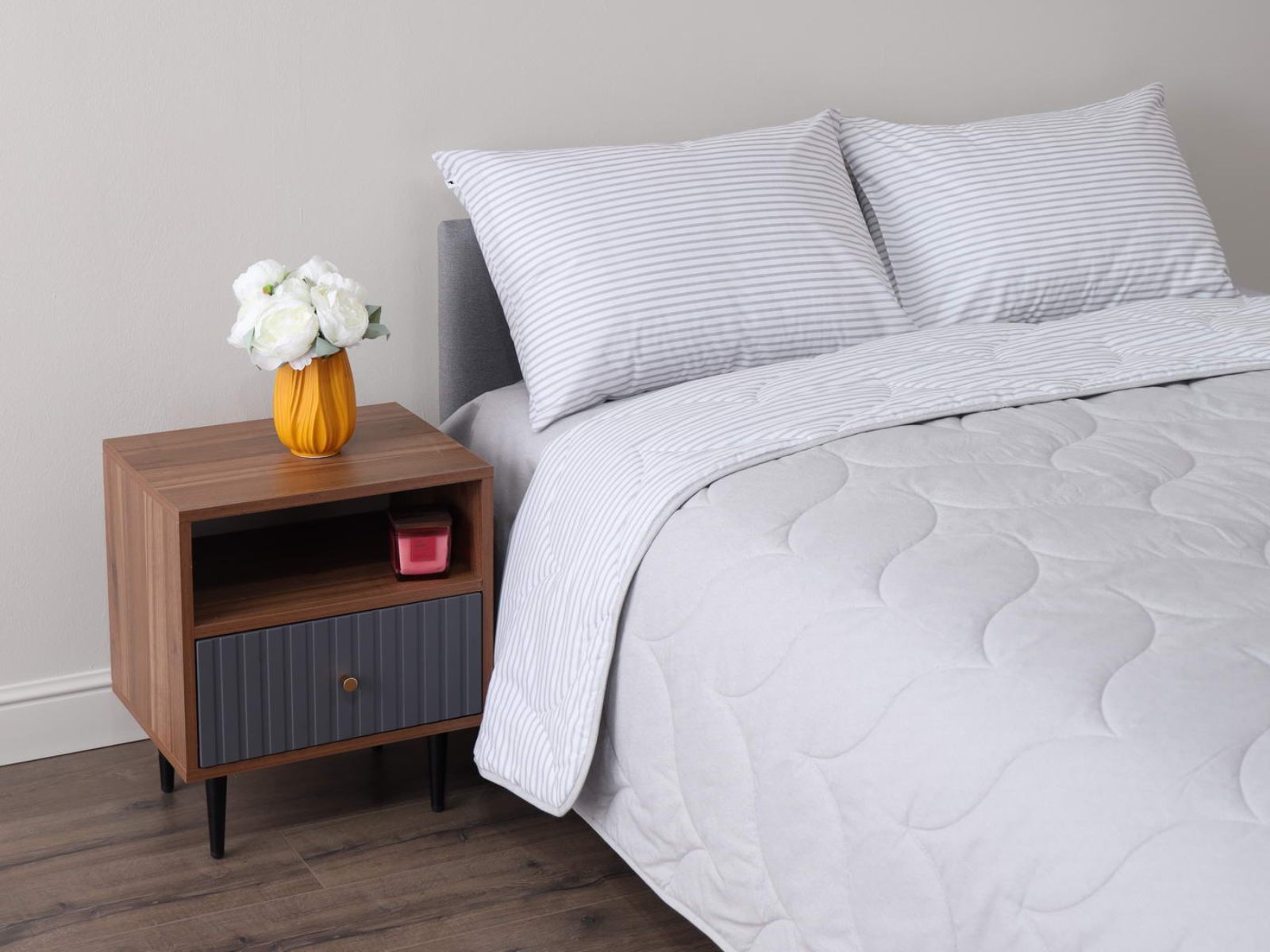Комплект Мелвин легко стирается в обычной машине в бережном режиме и также легко гладится.