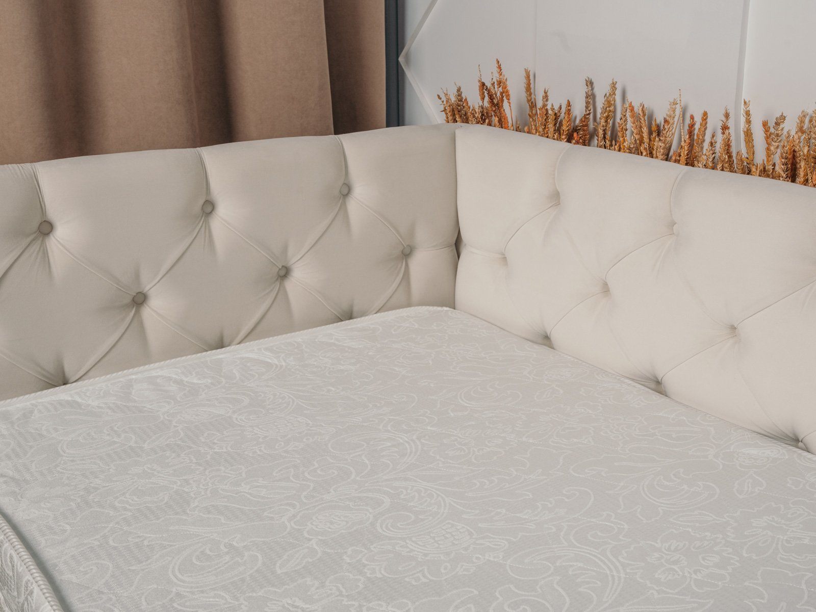 Обтяжка модели осуществляется бархатистым велюром. Под внешним материалом размещается плотный пенополиуретановый слой, который обеспечивает мягкость и удобство изголовья. Материал обивки не боится частого трения, прост в уходе и приятен при соприкосновениях. При стандартной комплектации обратная сторона изголовья выполняется из технического материала. Однако по желанию его можно заменить на основную обивку кровати.