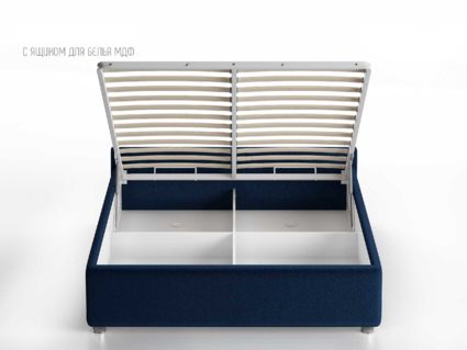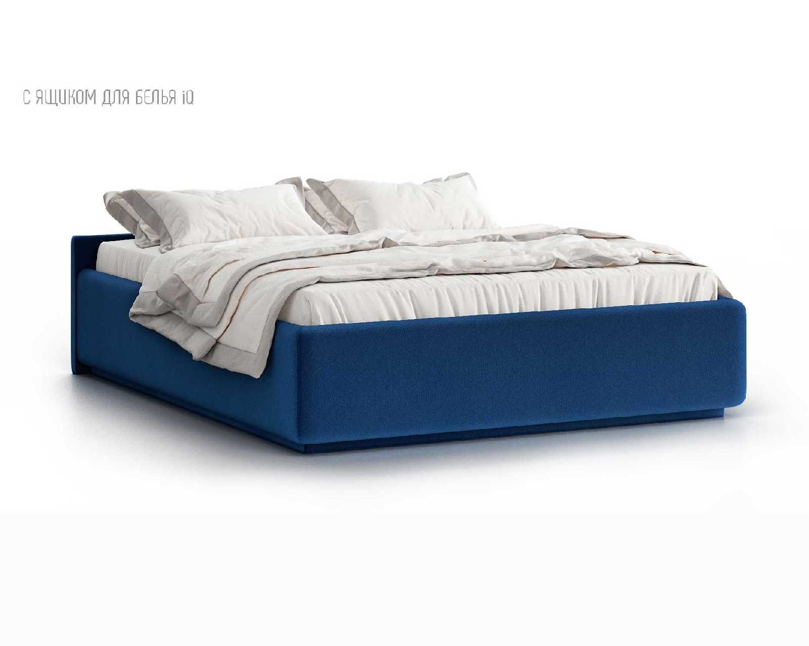 Кровать укомплектована IQ с подъемным механизмом и ящиком для белья без дна (дополнительная платная опция - дно к ящику IQ из HDF (ХДФ). Каркас кровати на цоколе, декоративный чехол на цоколе съёмный. Глубина ящика для белья - 30 см, без ограничения нагрузки на ящик.
