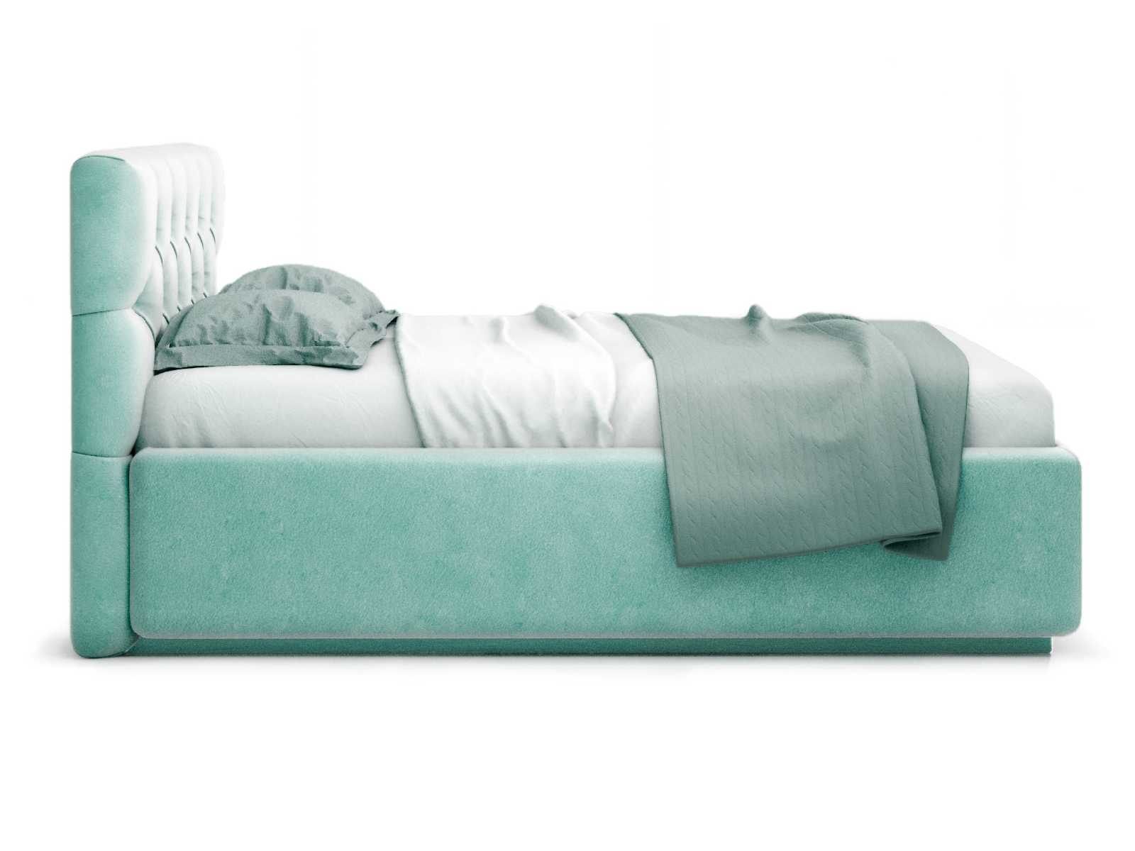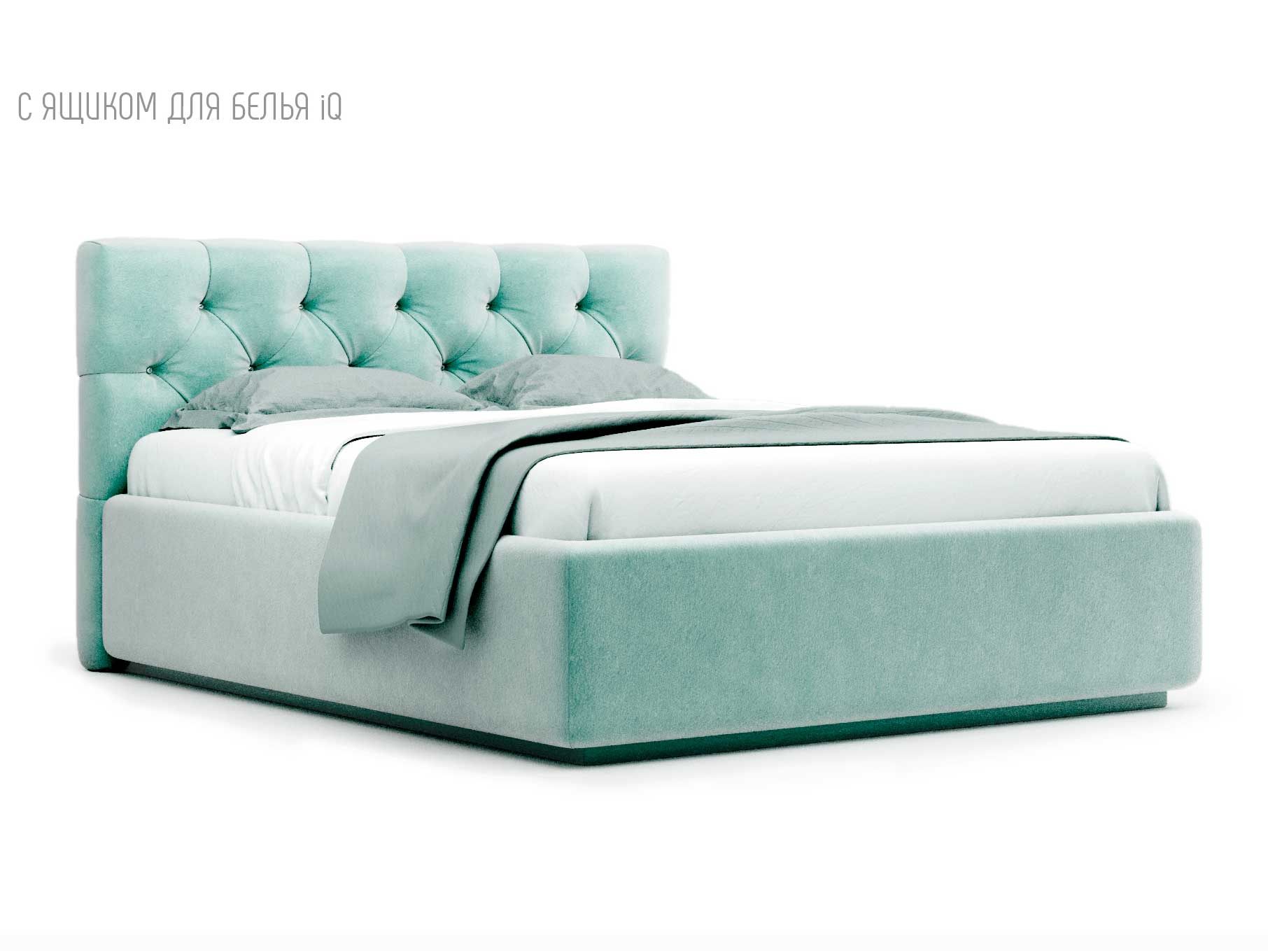 Кровать укомплектована IQ с подъемным механизмом и ящиком для белья без дна (дополнительная платная опция - дно к ящику IQ из HDF (ХДФ). Каркас кровати на цоколе, декоративный чехол на цоколе съёмный. Глубина ящика для белья - 30 см, без ограничения нагрузки на ящик.