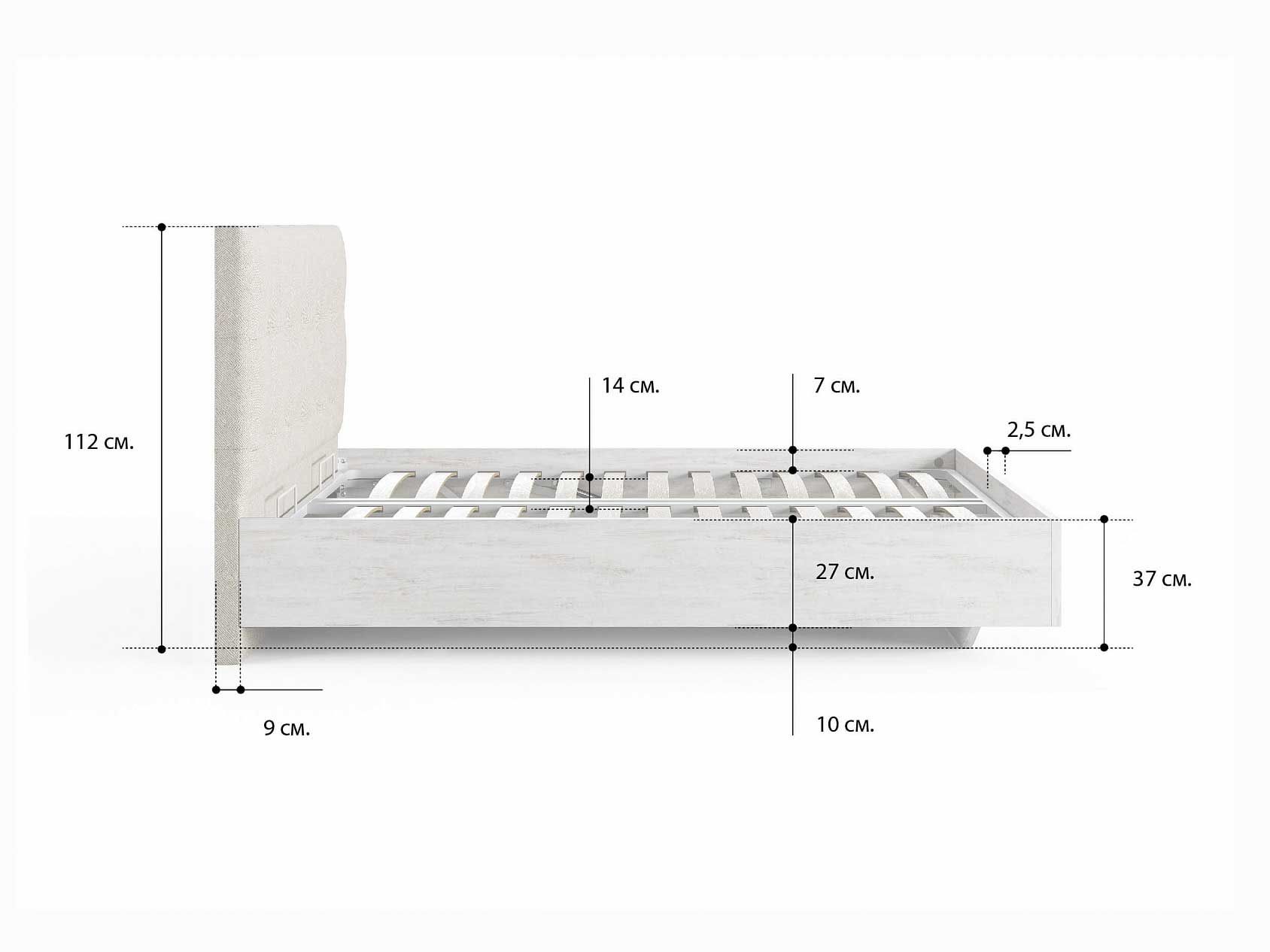 ЛДСП. Безопасный и экологичный ЛДСП стандарта Е1 содержания формальдегида. Увеличенная толщина плиты 25 мм делает кровать надежной. Современный и актуальный цвет.
