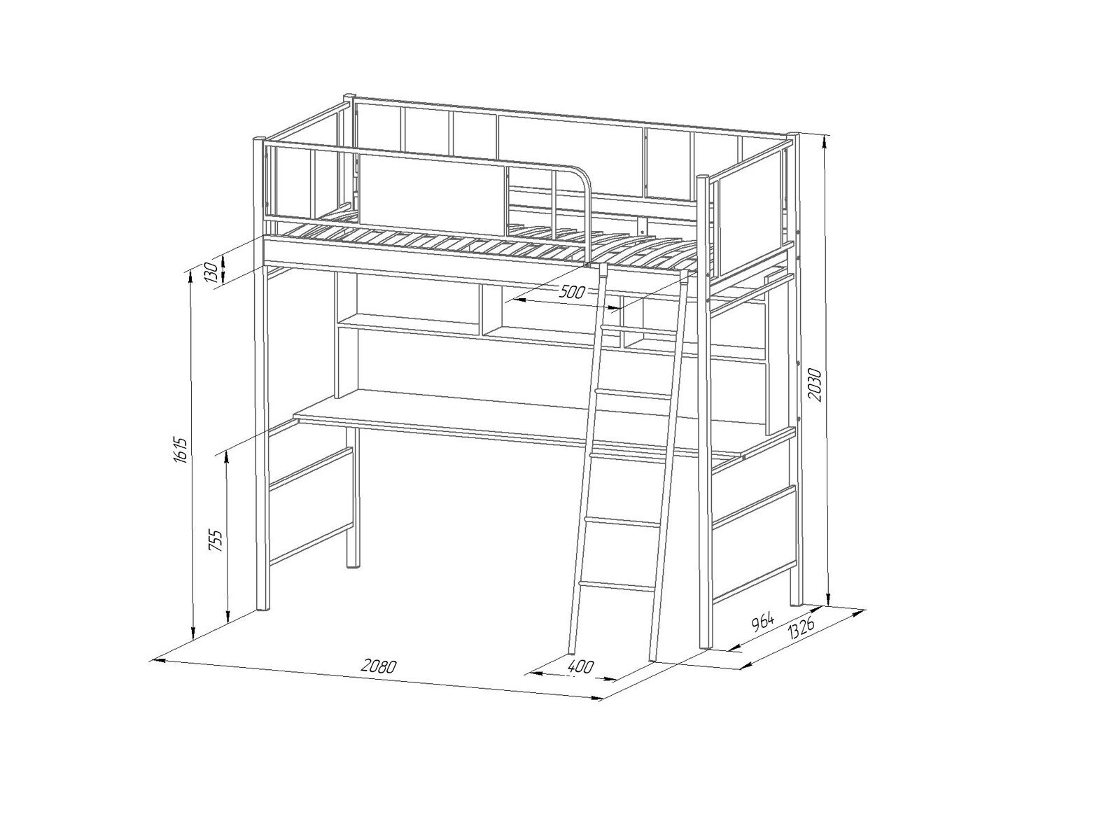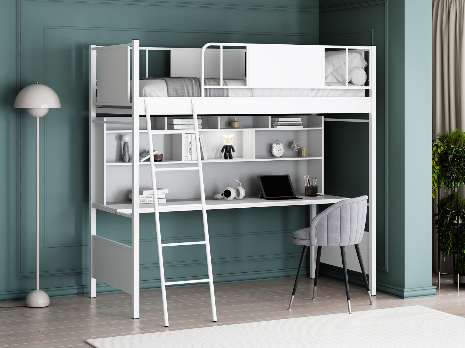 Модель оснащена столом с полками, что обеспечивает рабочее пространство для работы или учебы, а также металлической планкой под столешницей для дополнительной прочности.