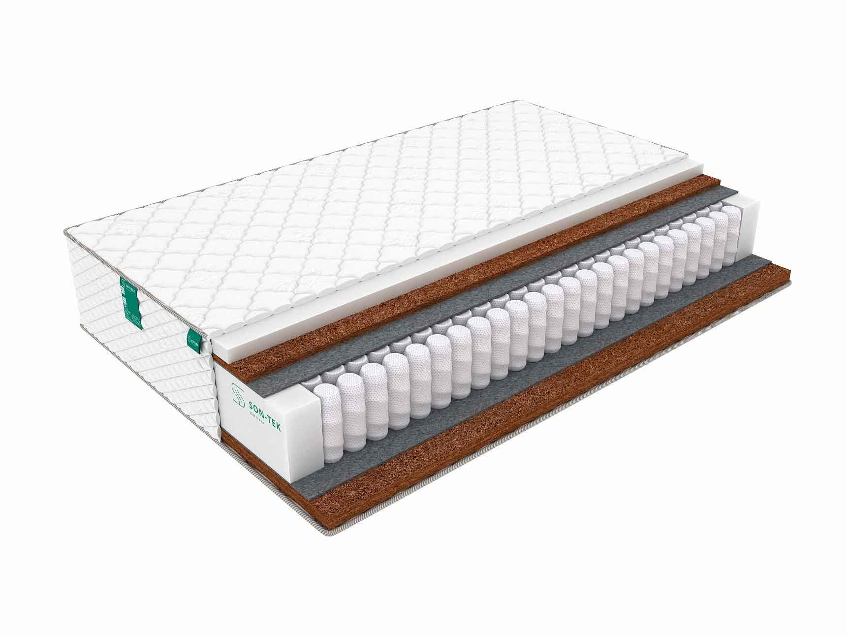 Наполнение у разных сторон матраса различное. С одной стороны находится комбинация койры кокоса и ортопедической пены – такое сочетание придает этой стороне умеренную жесткость. С другой стороны располагается жесткая койра, придающая этой спальной поверхности высокую упругость и твердость.
