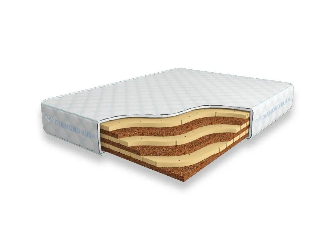 Матрас Diamond Rush SuperMix Cocos Contrast 18 DR является беспружинным, т.е. не имеет в своей основе пружинного блока. В его состав входит чередование слоев латексированной кокосовой койры и натурального латекса с перфорацией. Все слои по 3 см. Эта модель имеет разные по жесткости стороны.