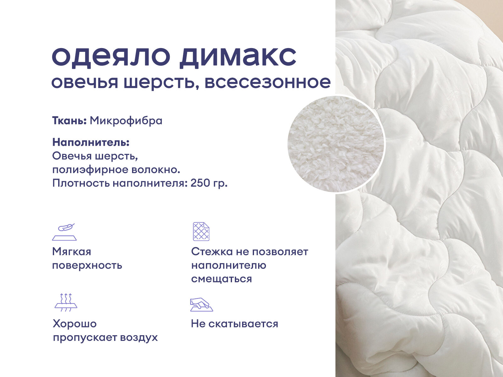 Идеальное решение для тех, кто ценит комфорт и заботится о своем здоровье! Благодаря уникальным свойствам натуральной шерсти, одеяло будет уместно не только зимой, но и в прохладные летние вечера, а также в межсезонье. Отдыхая под шерстяной моделью, вы сможете насладиться теплом и комфортом без ощущения духоты или излишнего перегрева. Это не просто предмет интерьера, а важный аксессуар для вашего здоровья и благополучия. Одеяло из овечьей шерсти универсально и подарит вам тепло и уют в любое время года.