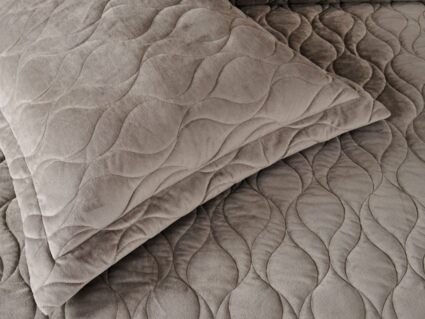 Покрывала и наволочки изготовлены из велюра высокой плотности - приятной на ощупь бархатистой ткани с коротким ворсом. Пошив покрывала с кантом, наволочки с ушками 5 см.